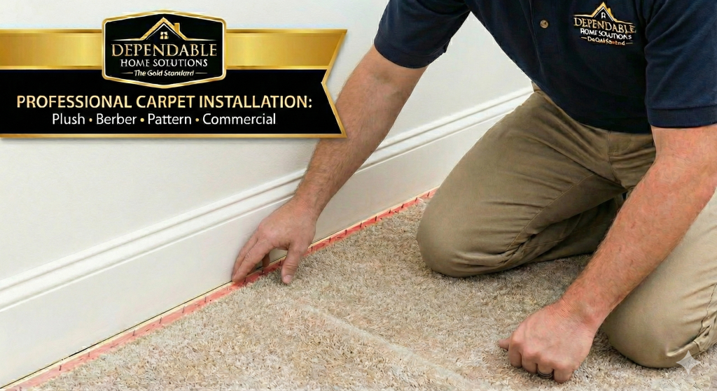 Dependable Home Solutions handles the entire process: we rip up the old, dusty carpet, inspect the subfloor, install premium padding, and stretch the new carpet tight for a wrinkle-free finish.