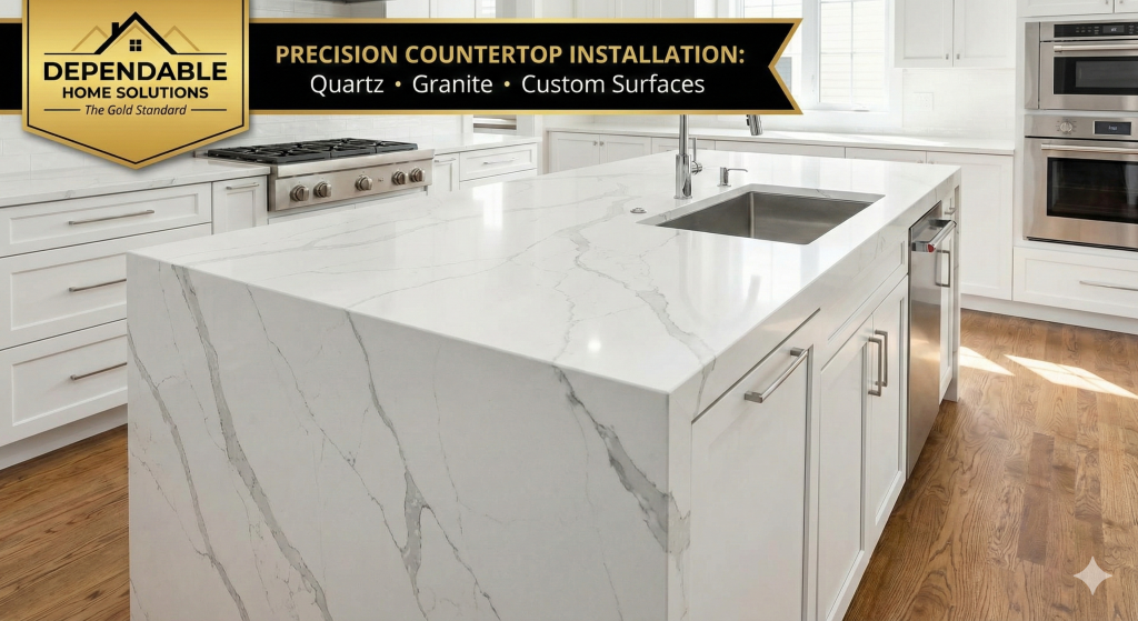 At Dependable Home Solutions, we don’t guess. We use Laser Templating technology to ensure your countertops fit your walls and cabinets within a fraction of an inch. No large gaps, no uneven seams—just a perfect, custom fit.